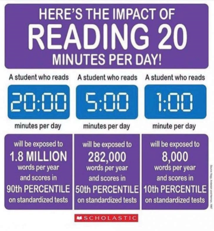 A child spends 900 hours a year in school but 7,800 hours at home – what you do at home matters. 20 minutes spent reading per day helps develop critical reading skills -Those that read the most, read the best.
